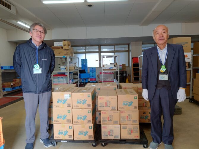 「必要とされる皆さまへお渡しください。」というお言葉とともに、災害備蓄飲料水500ml✕24を30ケースご寄贈いただきました。